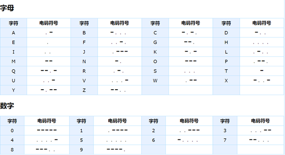 摩尔斯电码(又译为摩斯密码,Morse code)是一种时通时断的信号代码,用一系列圆点和破折号表示字母表中的每个英文字母,每个数字和一些特殊标点符号,如下图1所示。